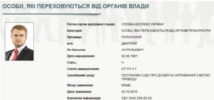 Служба безопасности разместила объявление о розыске "заместителя председателя Совета министров Республики Крым - министра внутренней политики, информации и связи РК" Дмитрия Полонского.