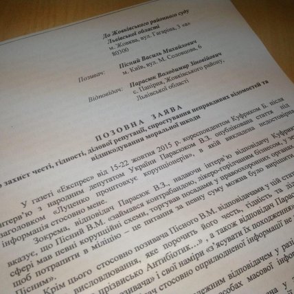 Также на странице в соцсети размещено фотография искового заявления от В.Писног в Жовковский районный суд Львовской области, где ответчиком значится В.Парасюк.