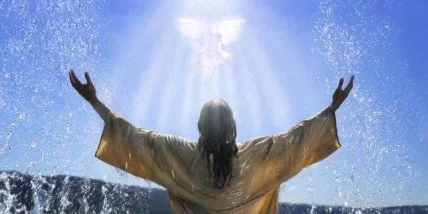 Евангелие от Иоанна также говорит о водном крещении Иисуса и сошествии Святого Духа, но не прямо, а в форме свидетельства Иоанна Крестителя. Из Евангелия известно, что Иоанн Креститель, призывая народ к покаянию, крестил людей в водах Иордана.