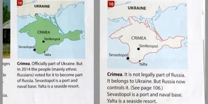 Новая версия школьного учебника Geog.3 поступила в продажу 29 февраля. В ней подчеркивается, что в соответствии с международного права, Крым принадлежит Украине. В учебнике указано, что ООН не признает Крым как часть российской территории, а большинство стран мира, в том числе Великобритания, осудили незаконный референдум в 2014 году на полуострове.