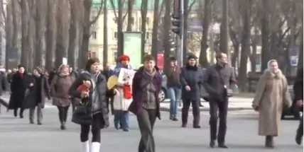 По его словам, собравшихся около 100 человек, они кричат "Позор России" и "Свободу Савченно".