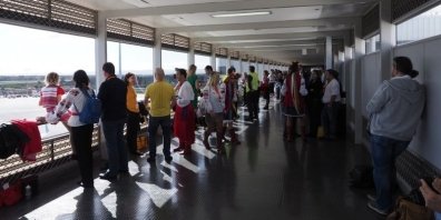 Увидев общество в вышиванках, пилот самолета после того как вырулил на посадку, вывесил из окна украинский флаг.