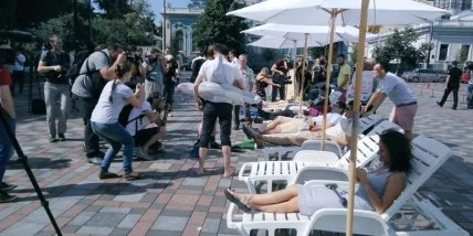 Активисты установили на площади перед ВР шезлонги и зонтики, а также импровизированный мини-бассейн. На этих шезлонгах лежат участники акции, которые изображают депутатов на курортах. Вокруг них якобы плавает надувная акула, которая должна загонять депутатов на работу.