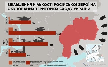В частности, количество танков с начала агрессии летом 2014 года по август 2016 года возросло с 30 до 600 единиц, количество боевых бронированных машин - с 124 до 1260, артиллерии и реактивных установок залпового огня - с 110 до 1060 единиц, зенитных установок - с 50 до 470.