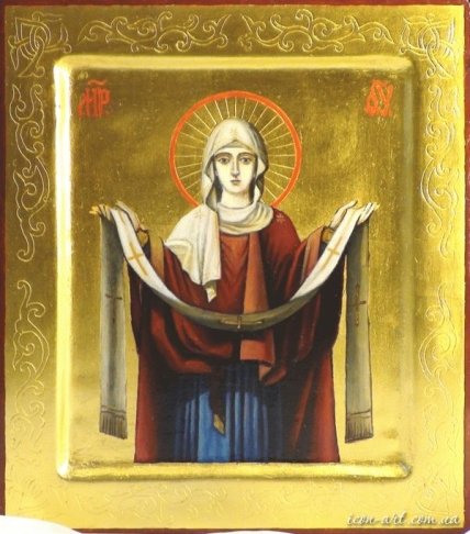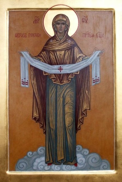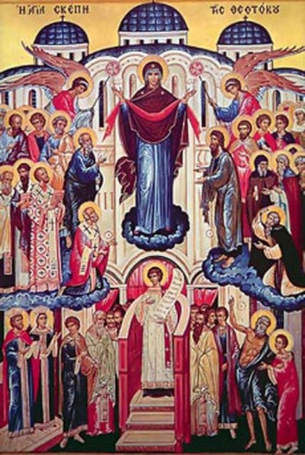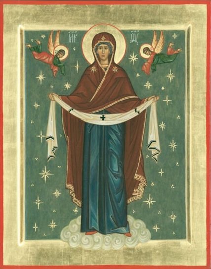 И видели они, как, преклонив колена, молилась Пречистая за христиан со всех концов земли, как, сняв с главы Своей подобно молнии блиставшее покрывало, распростерла его над молящимися. И стало покрывало столь огромным, что покрыло собою весь православный мир. "Видишь ли, брате?.." - "Вижу, святый отче…".