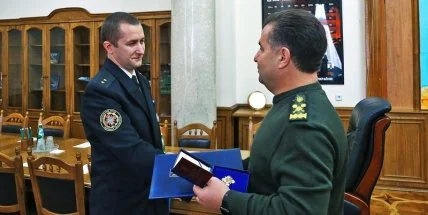 Сегодня министр обороны Украины генерал армии Украины Степан Полторак вручил медаль «За образцовую службу» лучшему выпускнику Академии высшего сержантского состава ВМС США прапорщику Роману Кузьменко.