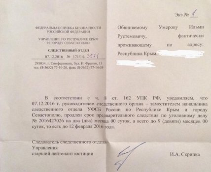 "Сегодня, в День прав человека, получил из ФСБ уведомление о том, что срок предварительного следствия по моему уголовному делу продлён до (!?) 12 февраля 2016 года... да-да - 2016, именно так и написано..." - сообщает Умеров.