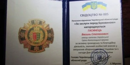 В честь Дня Соборности Украины настоятель храма Рождества Пресвятой Богородицы и Святого Антония Украинской греко-католической церкви отец Василий Гасинец из Черновцов получил почетную награду "За заслуги перед Буковиной".