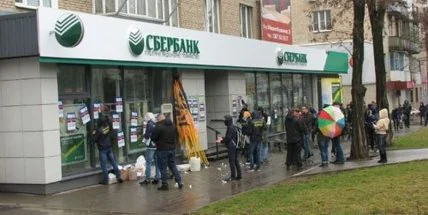 Партия "Национальный корпус" заявляет о временной приостановке блокады российских банков в Украине с тем, чтобы украинцы смогли забрать свои сбережения, однако планирует следующий этап до полного прекращения работы всех филиалов Сбербанка России в Украине.