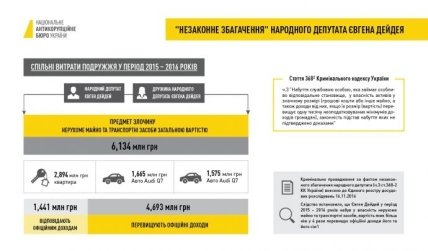 Антикоррупционные ведомства разъясняют, что документально подтвержденный совокупный доход супругов Дейдеев за период с 14 сентября 2007 года по 31 декабря 2016 года составил 1 млн 440 тыс. грн.