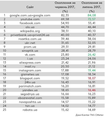 Об этом говорится в исследовании KANTAR TNS "Рейтинг популярных сайтов за июль 2017", передает Украинская правда.