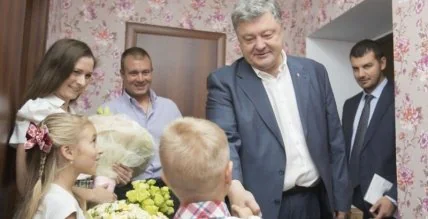 В День танкиста Президент Петр Порошенко посетил семью Героя Украины, танкиста Евгения Межевикина и поздравил их с новосельем.