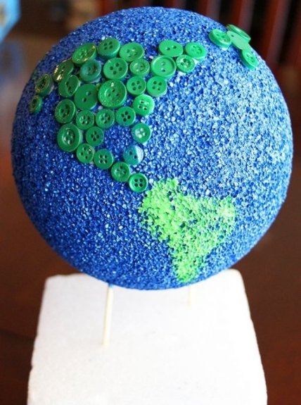 На пенопластовый куб прикрепите шар с помощью зубочисток. Используя карандаш, наметьте на шаре материки точно также, как они расположены на настоящем глобусе. Покройте их зеленой краской, остальную часть закрасьте синей краской. На один из материков нанесите клей и приклейте зеленые пуговицы, заполняя всю часть. Зону воды обклейте синими пуговицами. Готовый глобус установите на алюминиевую пластину, а пластмассовый куб покрасьте в коричневый цвет. Поделка готова! Ее смело можно дарить любимому педагогу на День учителя.
