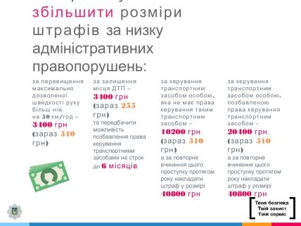 В несколько раз предлагается увеличить размеры штрафов за ряд административных правонарушений. В частности, за превышение максимально разрешенной скорости движения более чем на 50 км / ч., установить штраф 3400 гривен (сейчас штраф за это правонарушение 510 гривен). За оставление места ДТП предлагается установить штраф 3400 гривен и предусмотреть возможность лишения права управления транспортным средством на срок до шести месяцев.