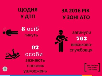"Только за последние два года в ДТП погибли более 5500 человек. Травмировано - более 57 000. Для сравнения за 2016 в зоне АТО, где фактически происходят настоящие боевые действия с применением современного вооружения, погибли 763 наших военнослужащих. Я хочу, чтобы все мы понимали, что новые правила - это не вопрос ограничения кого в правах и возможностях, а вопрос нашей безопасности. У нас на дорогах гибнет раза больше людей, чем в зоне АТО", - отметил Арсен Аваков.