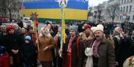 Как сообщает корреспондент Укринформа, с праздничной сцены одетые в традиционные украинские костюмы около 50 участников любительских детских коллективов "Веселий ярмарок" и "Гомін", юноши и взрослые с ярко украшенными рождественскими звездами отправились от храма Святой Софии к Михайловскому Златоверхому собору, распевая колядки. Во главе шествия несли символ Рождества - Дидуха, который символизирует богатство и благосостояние.