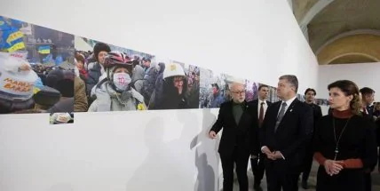 Президент Украины Петр Порошенко вместе с семьями Героев Небесной сотни на открытии выставки "Переведи меня через Майдан", посвященной участникам Революции Достоинства - творческим личностям, почтил минутой молчания память погибших. Глава государства также обратился к собравшимся.