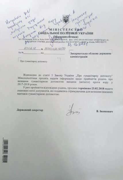 Министерство социальной политики направило письмо в Закарпатскую ОГА о срочном предоставлении документов о признании гуманитарной помощью вакцины против кори.