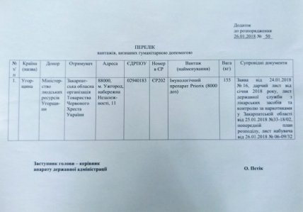 В копии письма, который также опубликован на сайте Г.Москаля, стоит его резолюция: "Направить для проверки все материалы о предоставлении Венгрией вакцины от кори для независимой проверки в Генеральную прокуратуру Украины".