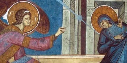 Через четыре месяца после обручении к Марии явился ангел и, когда она читала Священное Писание, сказал: "радуйся Благодатная! (то есть исполненная благодати Божией – даров Святого Духа). Господь с тобою! Благословенна ты между женами".