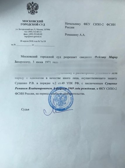 "Сущенко опять перевели из одиночки, куда он был помещён сразу после лишения меня адвокатского статуса, в камеру на двоих. Теперь у него сокамерник. А до этого заявляли, что перевод в одиночку вызван интересами безопасности. Как только суд меня вернул по ст.49 УПК необходимость выходит отпала? Ещё будет немало чудес...”, - написал Фейгин.