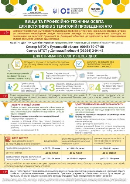 "Мы ждем жителей временно оккупированных территорий Донецкой и Луганской областей и АР Крым в украинских заведениях высшего образования. Напоминаем, что для абитуриентов действует специальная процедура, которая продлится до 28 сентября", - отмечают в МинВОТ.