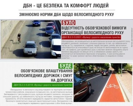 В зависимости от категорий улиц и дорог определяются соответствующие формы организации велосипедного движения в населенных пунктах, а также определяется минимальная ширина велосипедных полос и дорожек при новом строительстве или реконструкции (от 1,5 до 3 метров). Обновленная ГСН уже опубликована и вступит в силу с 1 сентября 2018 года.