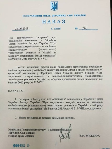 Начальник Генштаба ВСУ Виктор Муженко подписал приказ, регламентирующий выполнение командирами всех уровней управления выполнения закона об осуждении коммунистического и национал-социалистического (нацистского) тоталитарных режимов в Украине.