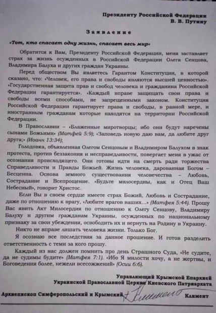 Архиепископ Симферопольский и Крымский Климент призвал президента России Владимира Путина проявить акт милосердия и освободить Олега Сенцова, Владимира Балуха и других украинских политзаключенных.