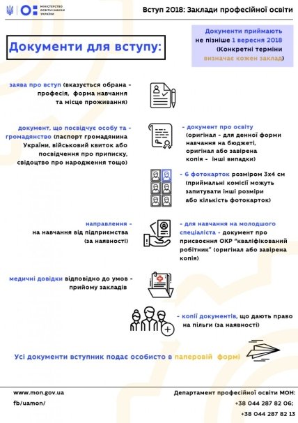"Вступительная кампания в учреждения профобразования не имеет четко определенных сроков - они самостоятельно объявляют конкурс, определяют даты вступительных экзаменов, формируют списки рекомендованных к зачислению. Ввиду комплектации групп, учреждения продолжают или завершают набор учеников, однако прием документов должен закончиться к началу занятий - до 1 сентября 2018 года", - отметила генеральный директор директората профессионального образования МОН Ирина Шумик.