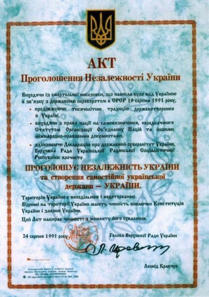 24 августа 1991 г., после попытки государственного переворота в СССР, внеочередная сессия Верховного Совета Украинской ССР своим постановлением утвердила "Акт провозглашения независимости Украины".