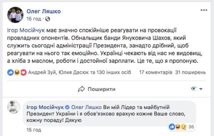 Мосийчук оставил под постом Ляшко льстивый комментарий. "Вы мой Лидер и будущий Президент Украины и я обязательно учту каждое Ваше слово, каждый совет! Спасибо", - написал он.
