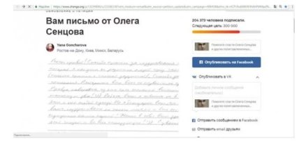 Письмо разослала активистка инициативы "РосУзник" Яна Гончарова электронной почтой всем, кто подписал петицию "Помогите спасти Олега Сенцова и других политзаключенных" к лидерам стран Европы, Америки и Азии. Он датирован 14-м августа.