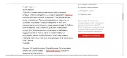 В письме Олег благодарит за поздравления с днем рождения, которые получил через сайт "РосУзник".