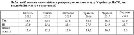 Если бы референдум о присоединении Украины к НАТО проходил в августе 2018 года в нем приняли бы участие 63% граждан, большинство из которых проголосовали бы за вступление в Североатлантический Альянс.