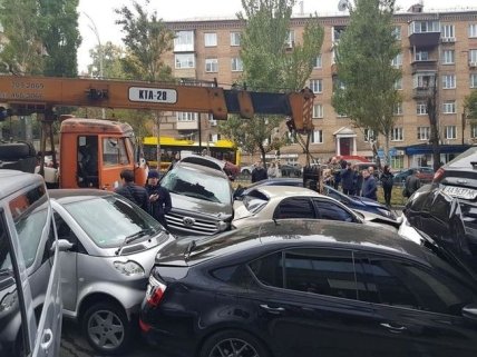 Так, автомобильный кран протаранил сразу 20 автомобилей. По предварительной информации, у автокрана не сработали тормоза.