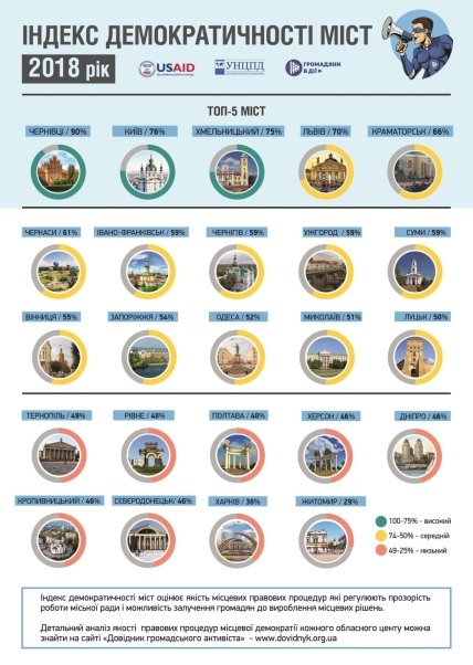 По результатам исследования Украинского независимого центра политических исследований в пятерку украинских городов с самым высоким уровнем прозрачности, демократичности и вовлеченности общества в принятие управленческих решений вошли Черновцы, Киев, Хмельницкий, Львов и Краматорск.
