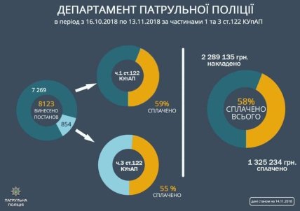 "Патрульными полицейскими в период с 16.10.2018 по 13.11.2018 за превышение установленных ограничений скорости движения вынесено 8 123 постановления о привлечении лиц к административной ответственности по частям первой и третьей статьи 122 КупАП. Наложено взыскание в виде штрафа на общую сумму 2 миллиона 289 тысяч 135 гривень, из которых уплачено добровольно на общую сумму 1 миллион 325 тысяч 234 гривни, что составляет 58% от общей суммы наложенных штрафов", - отметил он.