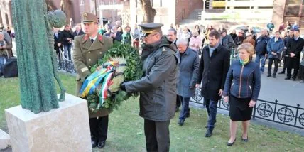 В церемонии открытия памятника приняли участие посол Украины в Венгрии Любовь Непоп и парламентский госсекретарь министерства внешней экономики и иностранных дел Левенте Мадьяр.