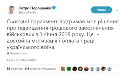 "Парламент поддержал мое решение о повышении денежного довольствия военных с 1 января 2019 года. Это достойная мотивация и оплата труда украинского воина", - написал он.