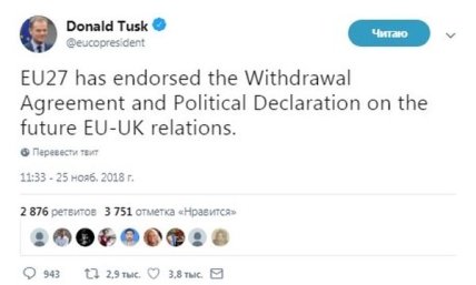 "27 стран ЕС одобрили соглашение о выходе и политическую декларацию о будущих отношениях ЕС и Великобритании", - написал Д.Туск в Twitter.