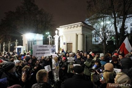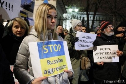 Около 200 человек в понедельник приняли участие в акции протеста под посольством РФ в Варшаве по поводу захвата российской стороной в воскресенье трех украинских судов с экипажами и ранения нескольких украинских моряков.