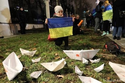 Активисты символически разложили перед посольством России забрызганные красной краской небольшие бумажные корабли, с надписями на них "Никополь", "Бердянск", "Яны Капу" что символизировало захваченные Россией корабли и раненых украинских моряков, сообщает корреспондент.