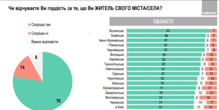 «Большинство опрошенных испытывают гордость за то, что они являются гражданами Украины (69%). Еще больше испытывают гордость за то, что они являются жителями своей области (74%) и своего города/села (78%). В то же время около трети опрошенных в Донецкой, Луганской, Харьковской, Полтавской, Запорожской и Одесской областях не имеют чувство гордости за то, что они являются гражданами Украины», - отметили социологи.