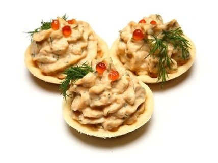 Нафаршируйте рыбным паштетом тарталетки. Перед подачей украсьте зеленью.