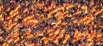 К акции протеста присоединилась правая партия Vox. Митинг проходит под лозунгом "За объединенную Испанию. Выборы сейчас!".