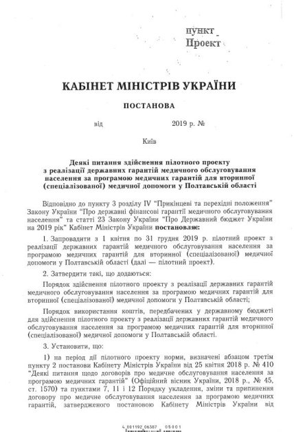 Правительство приняло решение о запуске пилотного проекта в Полтавской области с 1 апреля по 31 декабря. В рамках эксперимента договора о медобслуживании будут заключаться в электронной форме. Также Национальная служба здоровья будет оплачивать медицинские услуги амбулаторно-поликлинической помощи (в том числе и на дневном стационаре). Ставка будет рассчитана отдельно для каждой больницы.