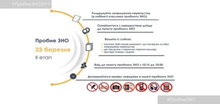 В Украинском центре оценивания качества образования сообщили, что пробное тестирование начнется в 11:00. Допуск к пунктам проведения пробного ВНО продлится с 10:15 до 10:50 и будет осуществляться по паспорту (или другому документу, удостоверяющему личность), приглашению. Участники, которые опоздали к месту проведения пробного ВНО не допускаются.
