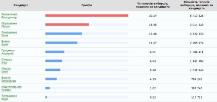 Шоумен Владимир Зеленский и действующий президент Украины Петр Порошенко набирают 30,24% и 15,95% голосов избирателей соответственно по итогам обработки 100% электронных протоколов Центральной избирательной комиссией.