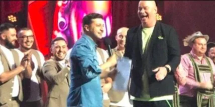 Зеленский притворно возмутился, а затем поцеловал Евгения Кошевого в лысину и пошел смотреть концерт в зал. Новоизбранный президент Украины сел возле своей жены в первом ряду и наслаждался комедийным шоу.
